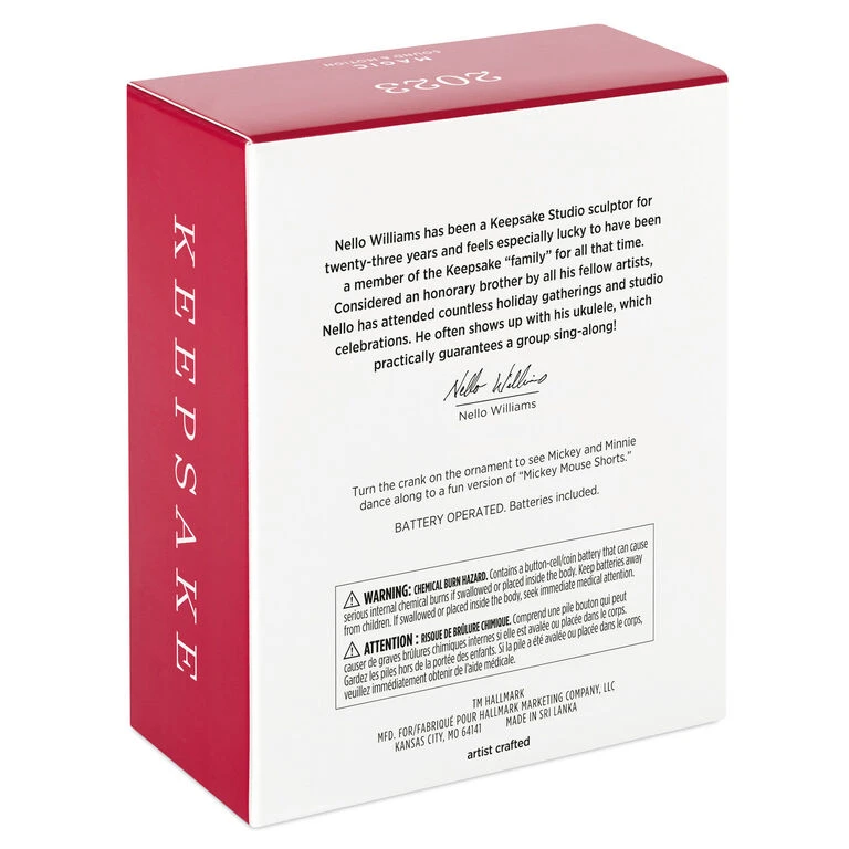- Key Features: Turn the crank on the Magic Sound and Motion ornament to see Mickey and Minnie dance along to a fun version of “Mickey Mouse Shorts.”