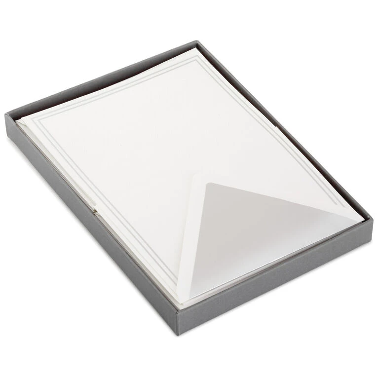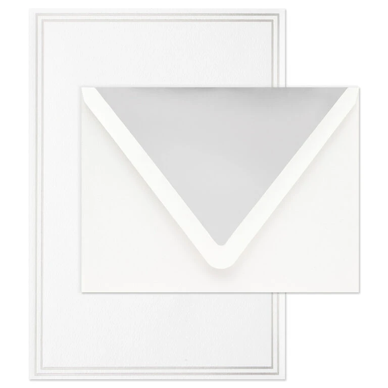 - Stationery sheets feature silver foil accents.