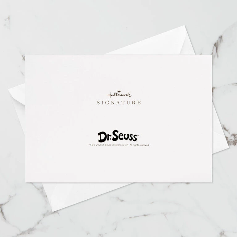 Pop-up Christmas greeting card features the Grinch from the Dr. Seuss classic “How the Grinch Stole Christmas!” peeking out of a wreath paired with a fun message and green foil border on the front. Simply open the card to reveal the 3D pop-up surprise inside—no assembly required: an intricate, laser-cut scene featuring characters from this beloved holiday story pops out. Green foil accents add a festive touch to the inside of the card. This festive greeting crafted from premium card stock is a work of art sure to be displayed all season long, making it an unforgettable way to share Christmas and New Year wishes with kids, friends or family members. When open, card lays flat for display; 3D pop-up inside measures approx. 5.75″ H.