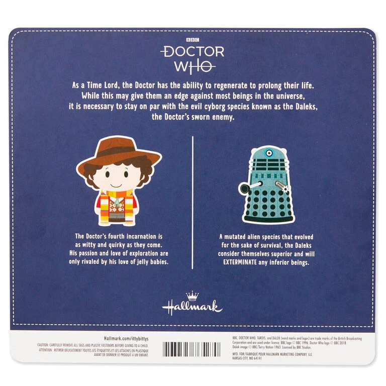 - itty bittys Doctor Who plush set includes 2 characters crafted from soft fabric: The Fourth Doctor and a Dalek.