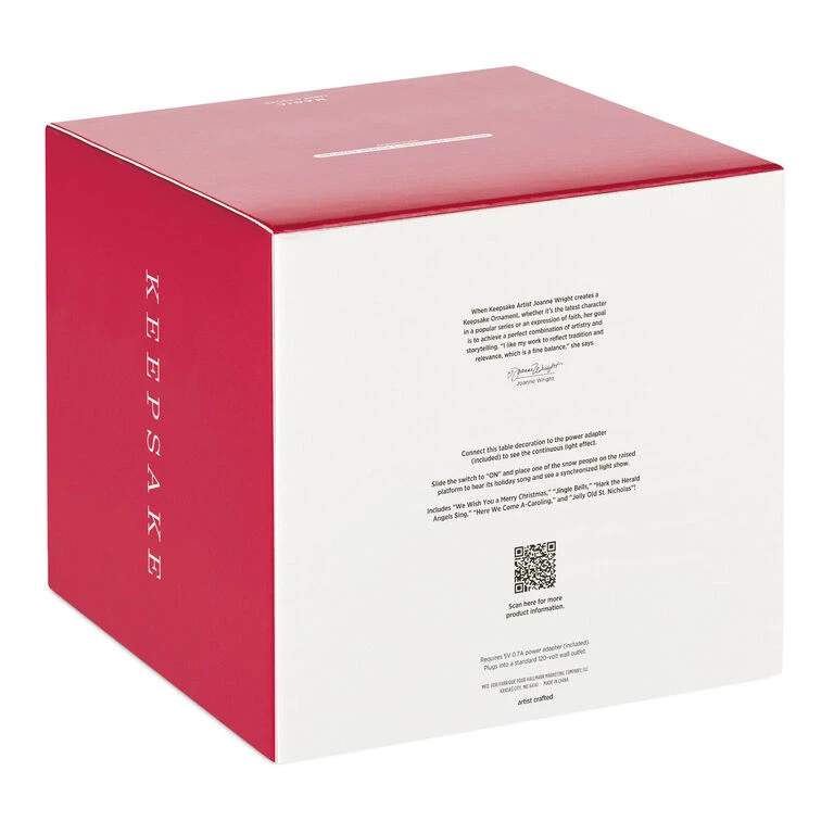 Create a festive, musical winter wonderland in the cozy comfort of your holiday home. Inspired by the Snowtop Lodge Hallmark Keepsake Ornaments created by Hallmark Artist Joanne Wright, this adorable interactive tabletop decoration features five charming snowmen standing in the snow around a sparkling Christmas tree. Connect to the included power adapter to see a continuous light effect. Then place one of the snowmen on the raised platform to hear a holiday song and see a synchronized light show. Plays “We Wish You a Merry Christmas,” “Jingle Bells,” “Hark the Herald Angels Sing,” “Here We Come A-Caroling” and “Jolly Old St. Nicholas.” No batteries necessary.